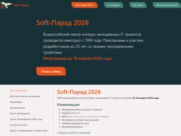 17марта Открыт приём заявок на участие в конкурсе молодёжных IT-проектов «Soft-Парад 2026» 23–24 апреля 2026 года в Красноярске пройдёт Soft-Парад — региональный смотр-конкурс молодёжных IT-проектов. Приглашаем к участию учащихся школ, техникумов и колледжей, студентов и аспирантов вузов, работающую молодёжь (до 35 лет включительно) с IT-проектами собственной разработки любой тематики. Приём заявок продлится до 19 апреля.