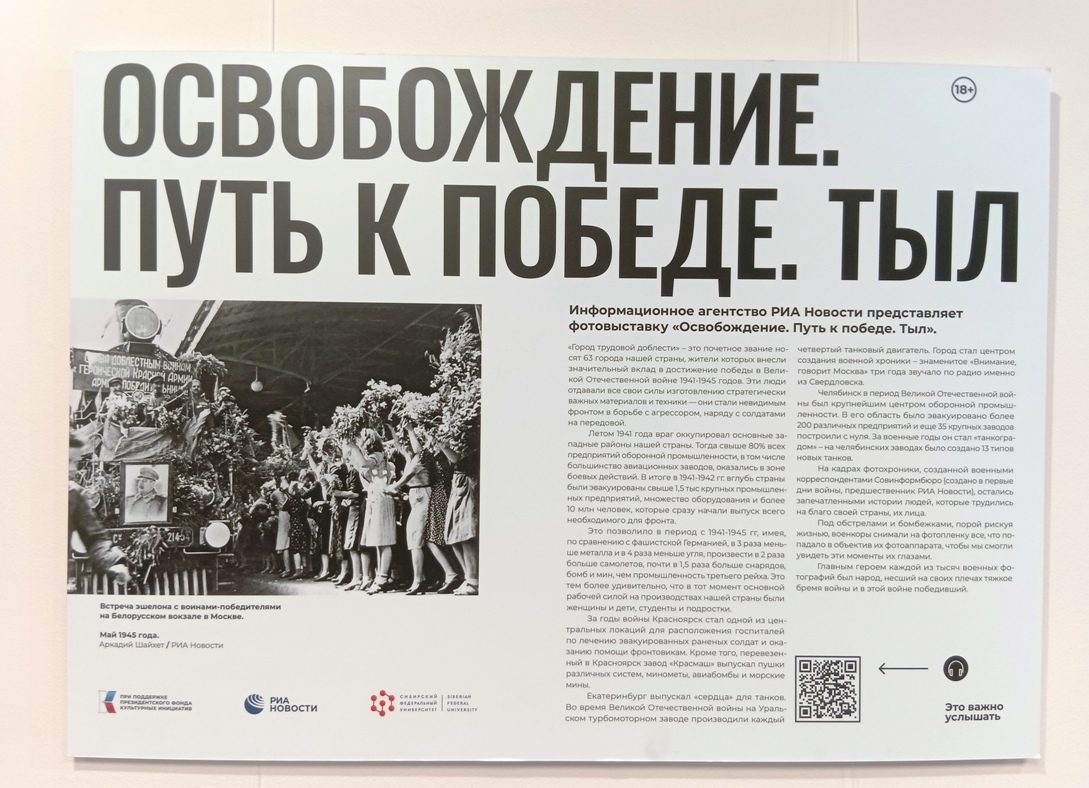 В фойе института открылась уникальная фотовыставка, посвященная 80-летию Победы в Великой Отечественной войне. Фотопроект «Освобождение. Путь к Победе. Тыл» реализуется при поддержке Президентского фонда культурных инициатив. Выставки работают на площадках университетов всей нашей страны. Экспозиция основана на архивах Совинформбюро. На 30 фотографиях военных корреспондентов запечатлены исторические мгновения жизни в тылу: обоз с продовольствием, выпуск мин, сборка истребителей, плавка чугуна на заводах, запись обращения Юрия Левитана. На снимках сохранены образы простых людей на фронте, в тылу, в ходе освобождения и восстановления исторических территорий России. Особое внимание в рамках проекта уделено теме подвига советской молодёжи в тылу в военные годы, единству исторической судьбы страны от Красноярска до Калининграда.